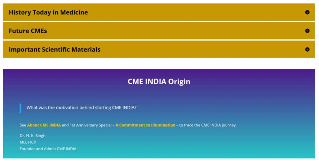 CME India  (www.cmeindia.in) is a pioneering digital platform dedicated to continuing medical education and professional development for healthcare practitioners in India. Founded by Dr. N. K. Singh, MD (Dhanbad, India), the platform aims to empower medical professionals with cutting-edge knowledge, foster collaboration, and improve patient care through digital means.