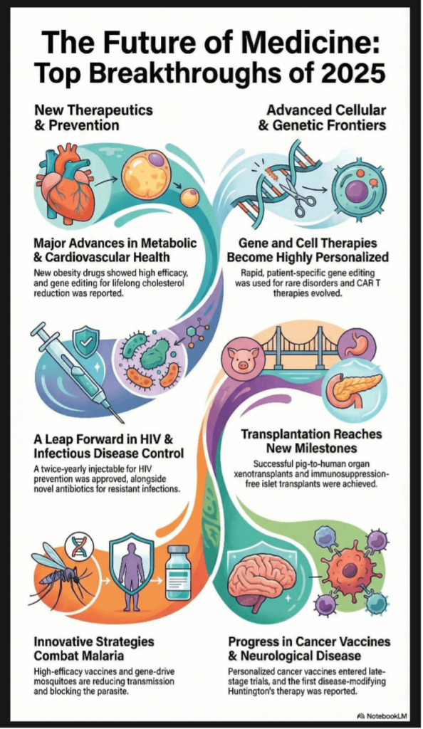 The year 2025 witnessed transformative progress across diabetes, thyroid disorders, cardiovascular medicine, nephrology, infectious disease, transplant science, and precision therapies — areas of particular relevance to Indian practice, given the high burden of metabolic disease, diverse infectious threats, and resource variability. Advances extended beyond glycaemic targets to include disease-modifying therapies, novel antibiotics, gene editing breakthroughs, and organ transplant milestones.