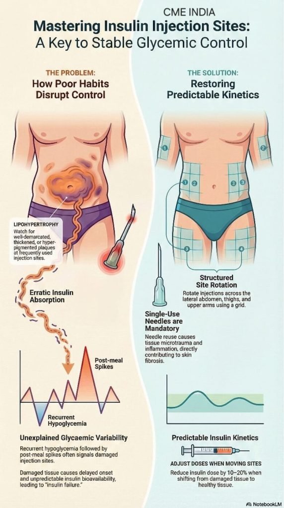 • Routine visual inspection and palpation of injection sites is a low-cost, high-yield clinical practice that can immediately identify this reversible cause of poor glycaemic control. International injection-technique guidelines emphasize site rotation, single-use needles, and regular reassessment of patient technique as standards of care.
